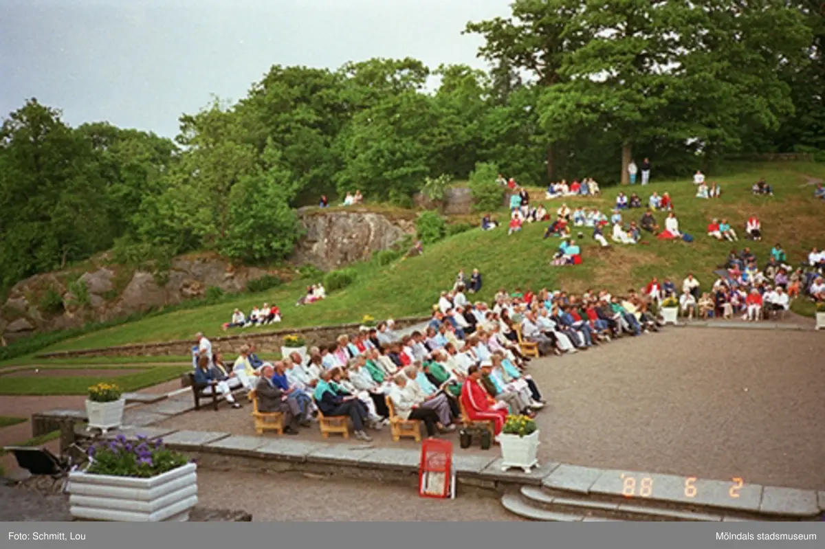 Titel: Människor som sitter och tittar på ett musik- och teateruppträdande på Gunnebo slotts framsida.