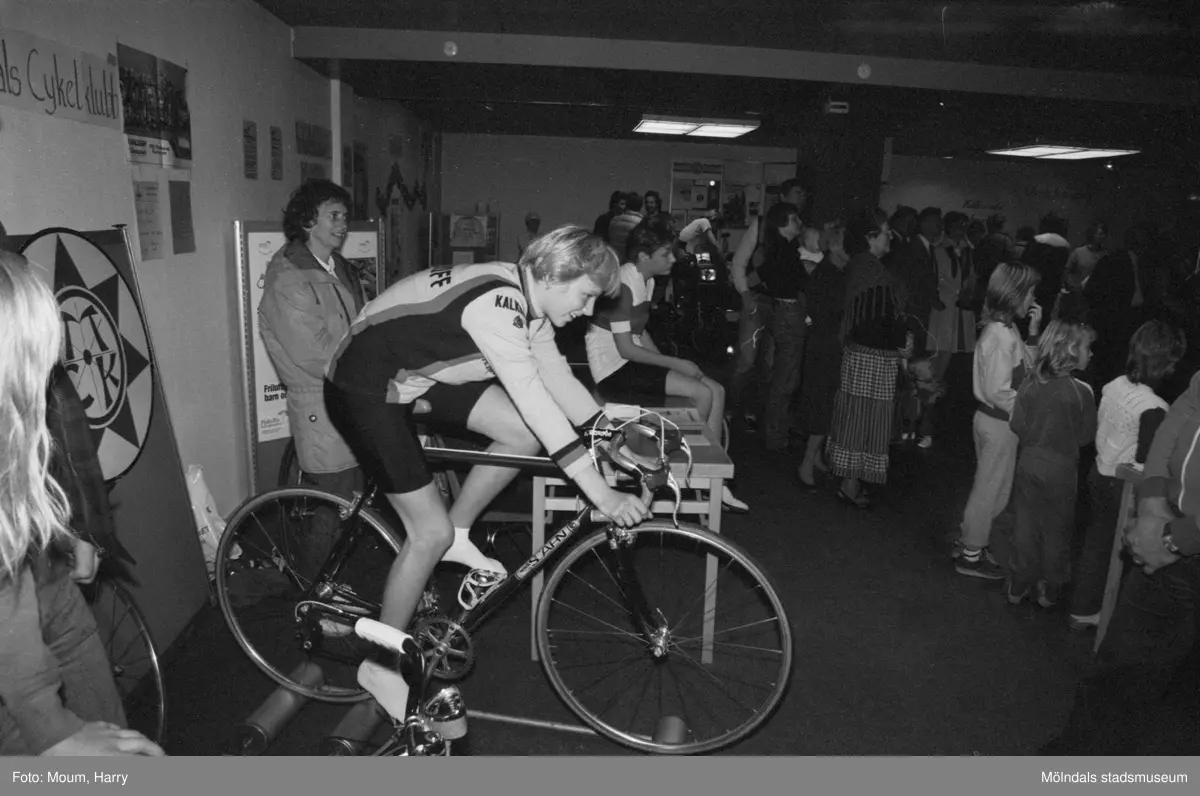 Föreningarna dag på fritidsgården i Kållered, år 1983. Mölndals Cykelklubb. "Ulrika Andersson är ett av Mölndals unga löften och testar här en rullmaskin."