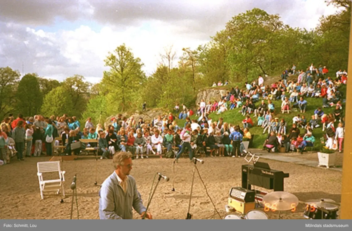 Människor som sitter på en grässluttning och inväntar ett musikaliskt uppträdande. Man ser en manlig körledare samt instrument på Gunnebo slotts framsida.