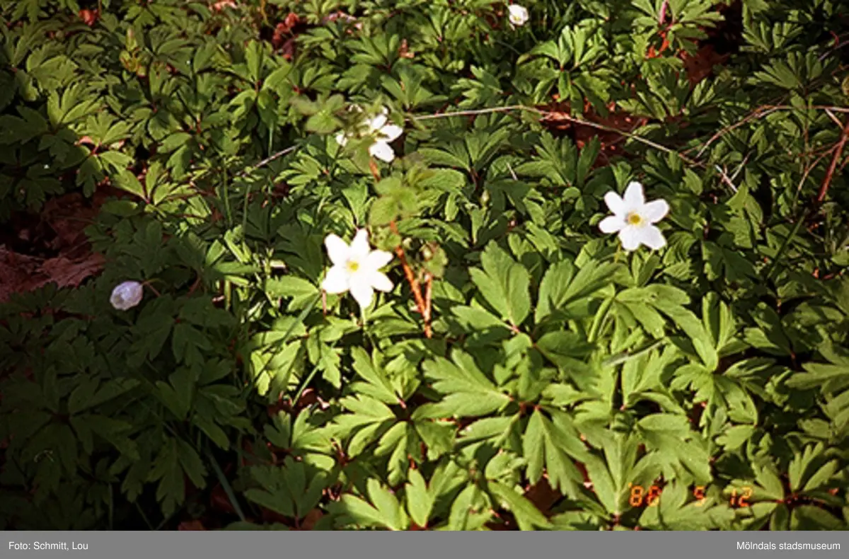 Närbild på några utslagna vitsippor som växer på Gunnebo slotts marker.