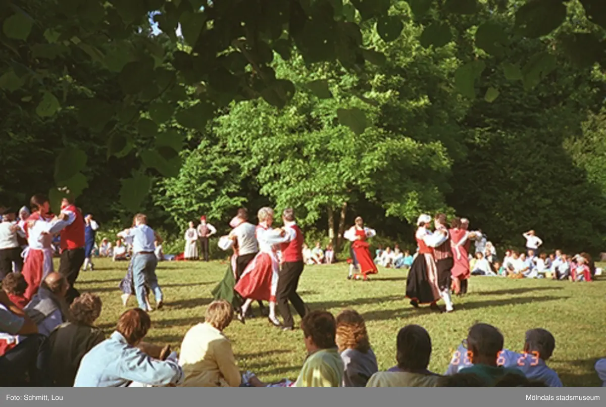 Ett folkdanslag som dansar på en gräsmatta vid Gunnebo slott. Runt omkring sitter människor och ser på.