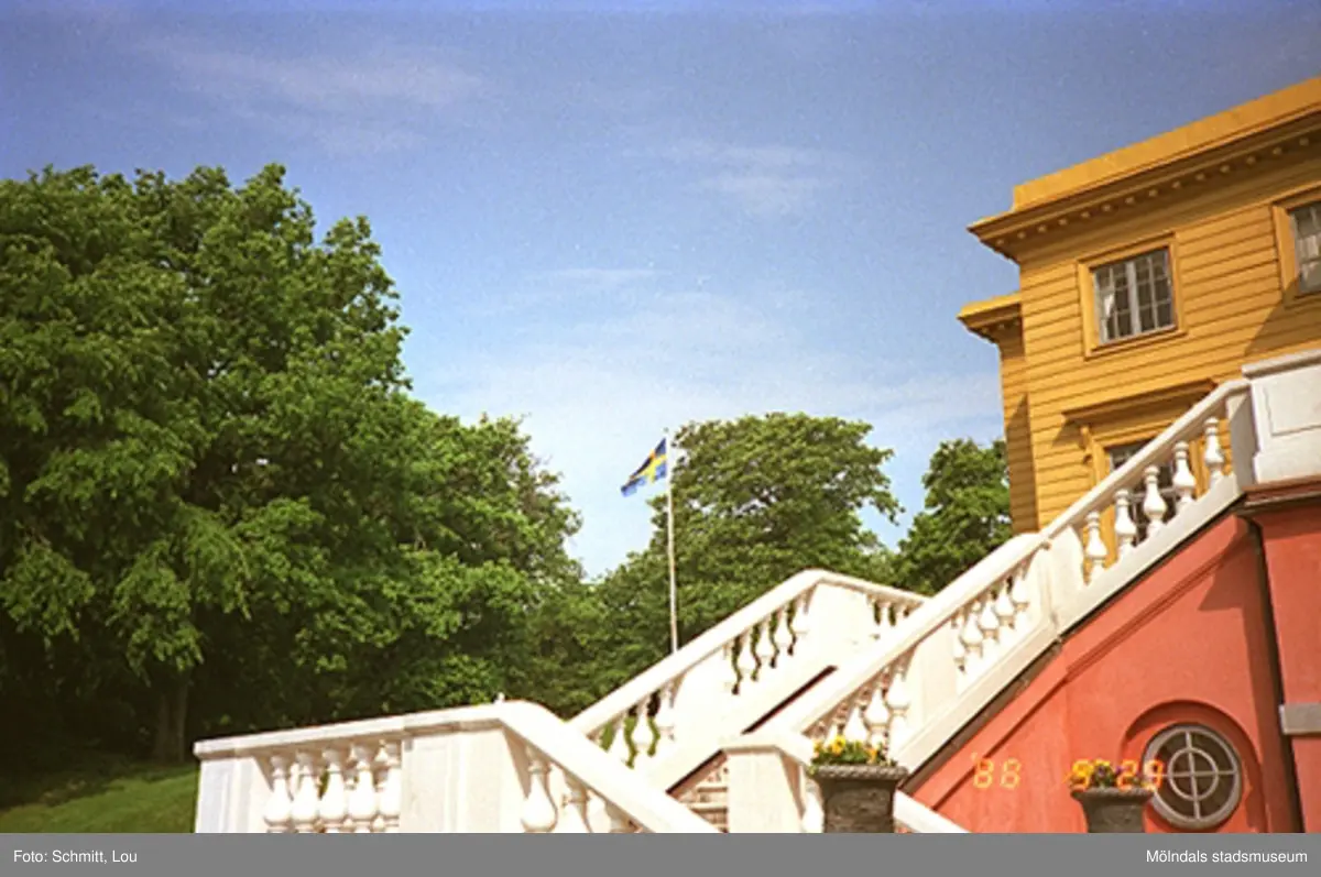 Titel: En rödokra-målad trappa med vitt räcke av sten som leder upp till Gunnebo slott. Man skymtar en liten del av slottet strax ovanför trappan. I bakgrunden ser man en flaggstång med Svenska flaggan hissad.