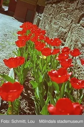 En rabatt med röda blommor. Blommorna växer utefter en mur vid Gunnebo slott. I bakgrunden ser man en skymt av en grusstig och slottet.