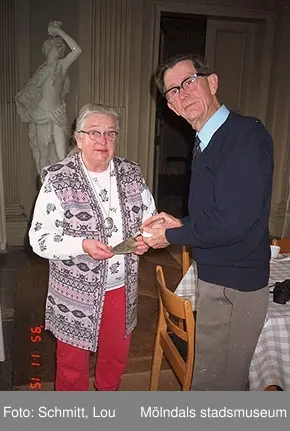 Avtackning av Johan och Anna-Greta Ryhag. De hade deltagit som frivilligarbetare i utgrävningarna på Gunnebo slott under ledning av arkeolog Lou Schmitt. November 1995.