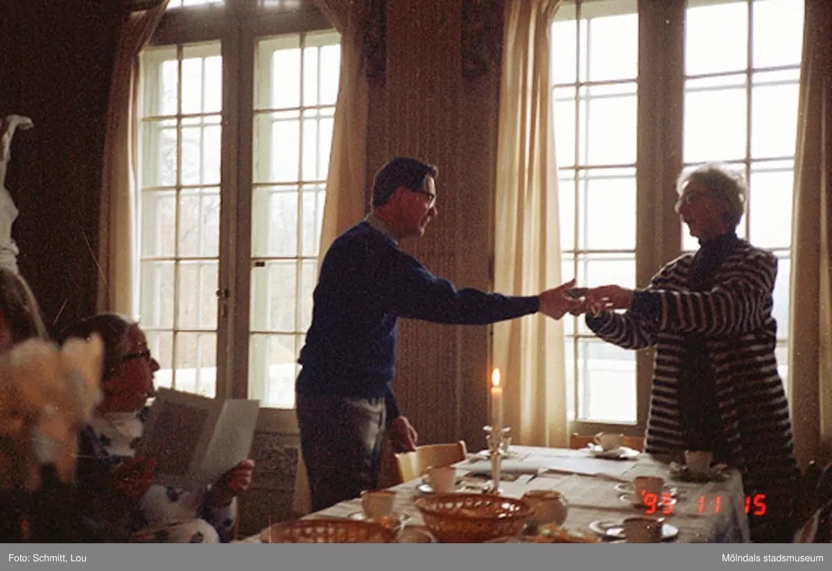 Titel: Avtackning av Johan och Anna-Greta Ryhag. De hade deltagit som frivilligarbetare i utgrävningarna på Gunnebo slott under ledning av arkeolog Lou Schmitt.