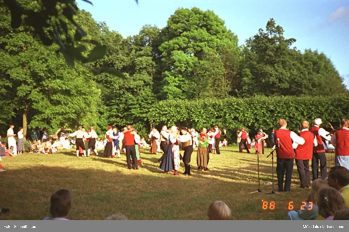 Ett folkdanslag, uppklädda i dräkter, dansar inför beskådare i Gunnebo slottspark.