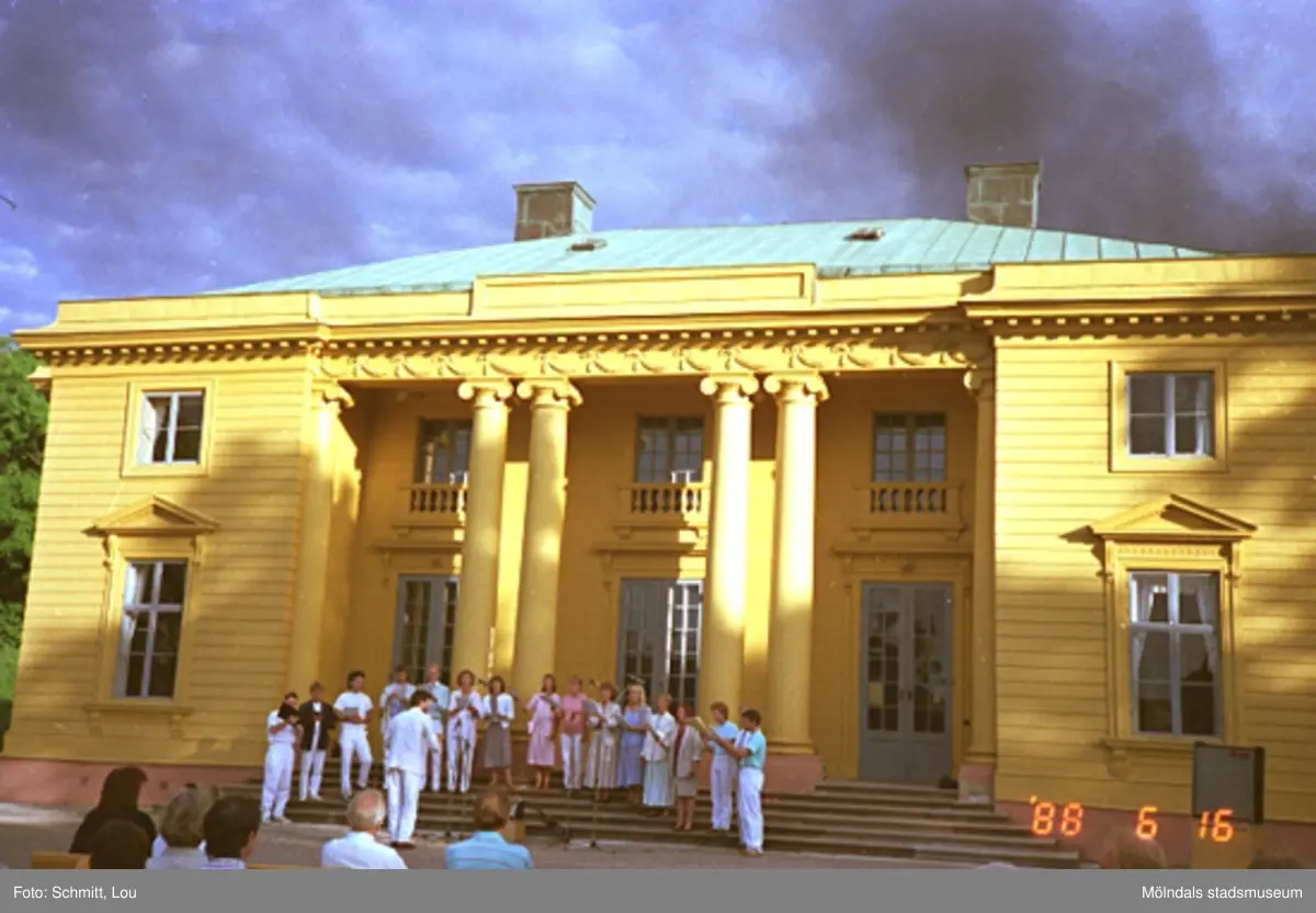 En sångkör som sjunger och brandrök i bakgrunden. Gunnebo slotts framsida.