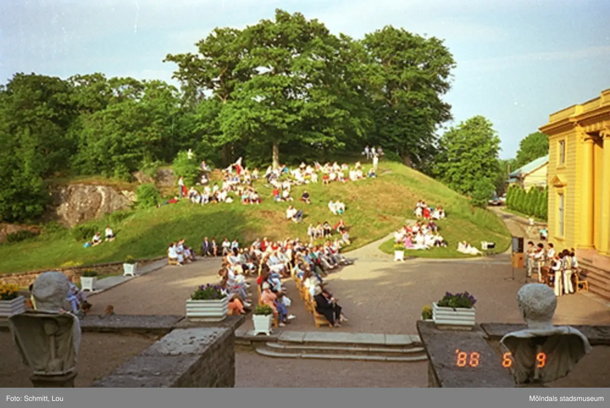 Titel: Musikunderhållning av en orkester vid Gunnebo slotts framsida. Människor sitter i gräset och på bänkar.