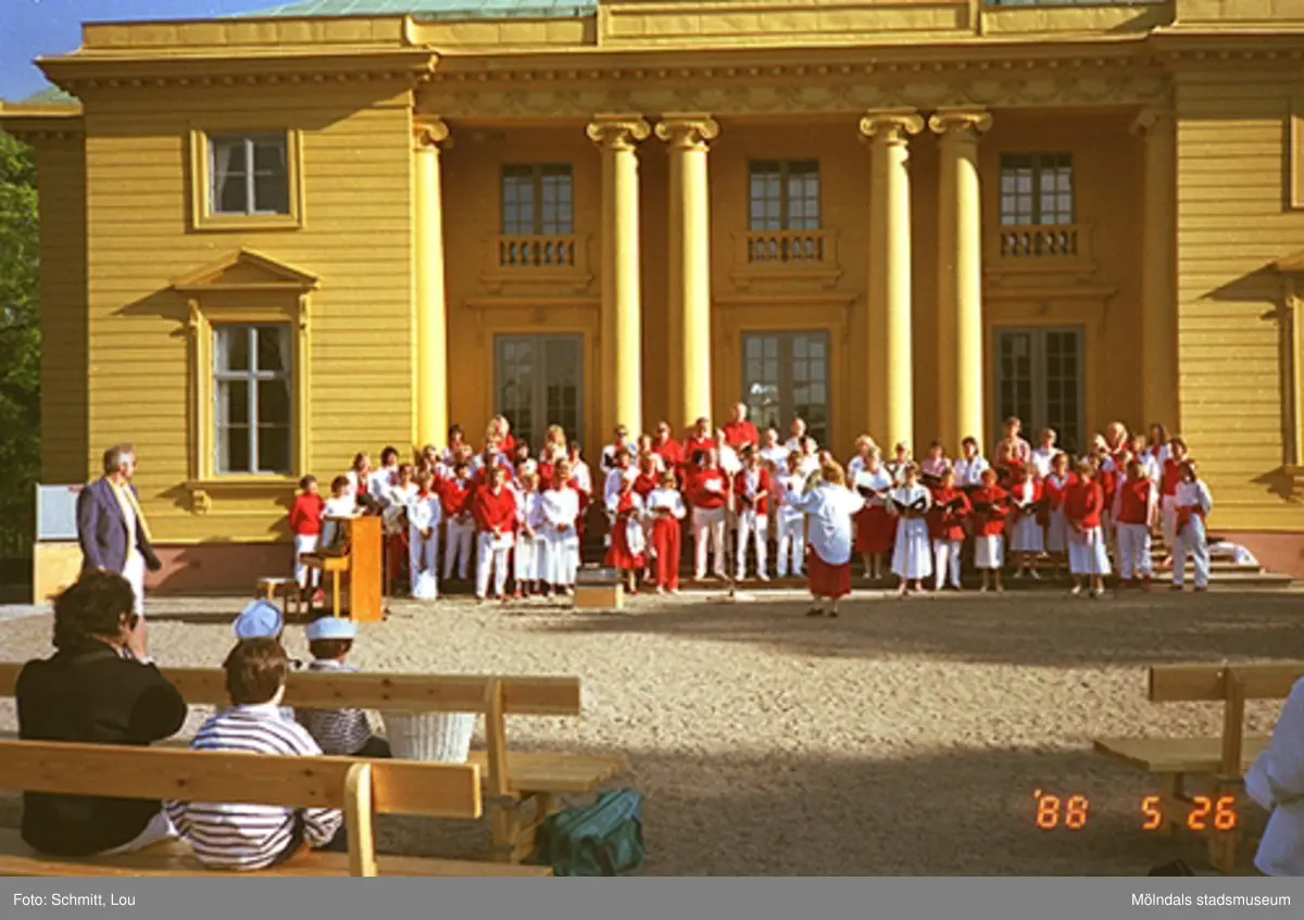 En kör som sjunger, ståendes på trappavsatsen som går upp mot Gunnebo slott. Klädkod för kören är rött och vitt. På grusplanen framför slottet sitter människor i bänkar och ser på.