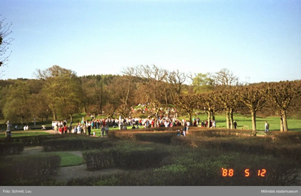 Folksamling kring en skulptur i Gunnebo slottspark. En studentkör sjunger.