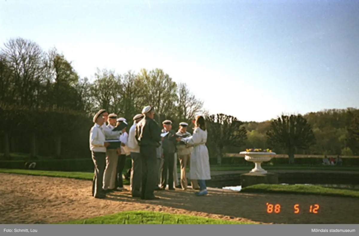En studentkör som sjuger vid dammen i Gunnebo slottspark den 12 maj 1988.