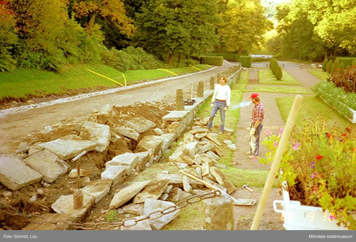 Stenarbete i parken vid Gunnebo slott, 1988-09-30.
