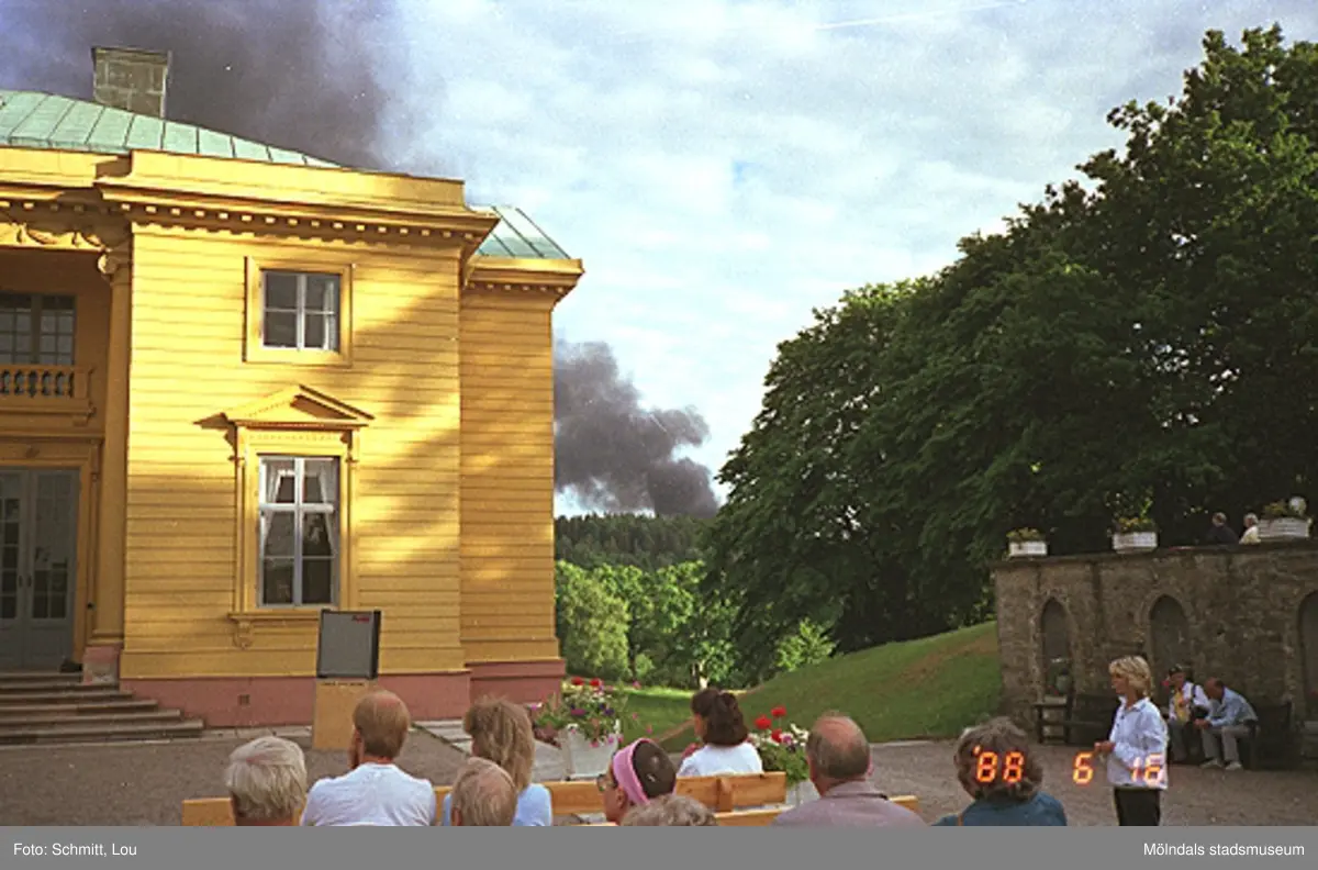 Publik som sitter på bänkar framför Gunnebo slott och lyssnar till en sångkör. Man kan se mörkgrå brandrök i fjärran, som troligtvis kommer från en grill.