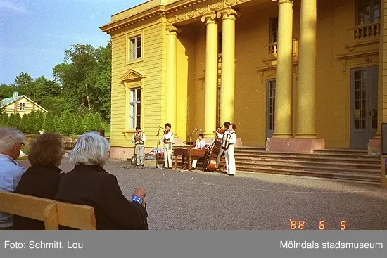 En orkester, bestående av sex män, spelar inför publik på Gunnebo slotts framsida.