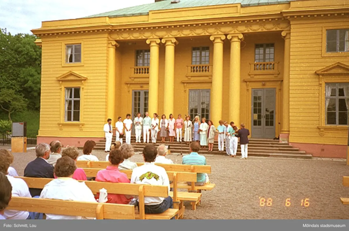 En sångkör samt två fiolspelande män står uppställda på trappan till det gulmålade Gunnebo slotts framsida. På grusplanen framför sitter publik i bänkar och lyssnar.