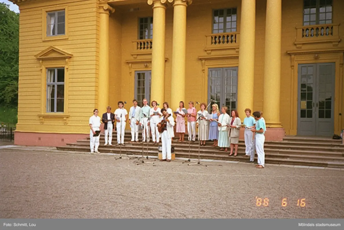 En kör och en gitarrist står uppställda på trappan till Gunnebo slotts framsida. De sjunger och spelar inför publik.