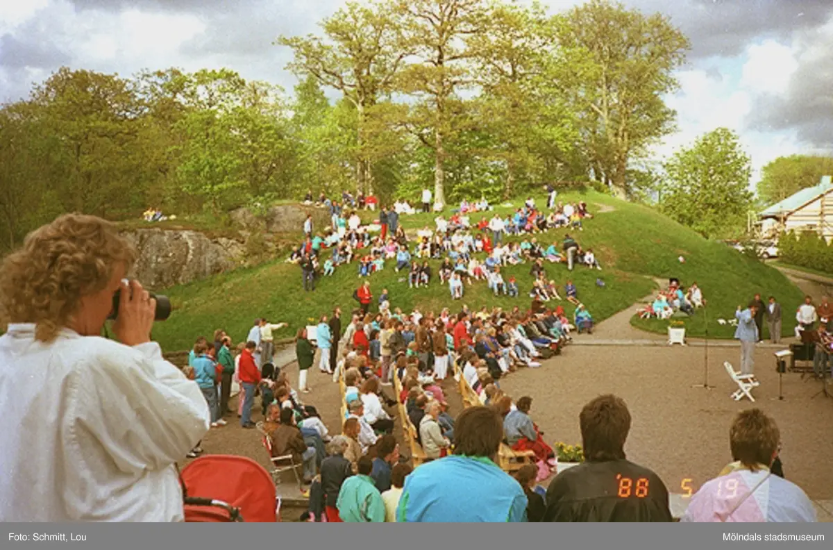 Människor, sittandes på bänkar eller i gräset, som lyssnar på någon sorts musikalisk underhållning som pågår på Gunnebo slotts framsida.