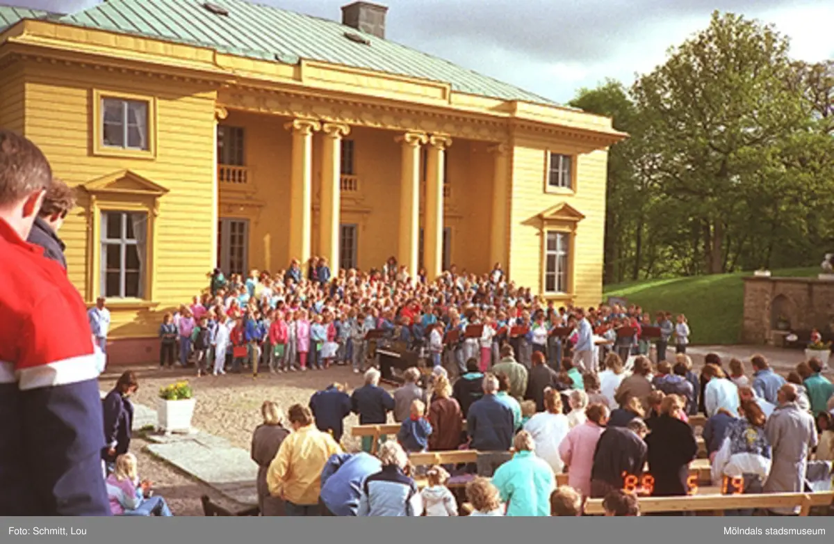 Föreställning med flertalet barn som spelar och sjunger. De står på trappan till Gunnebo slotts framsida. På grusplanen framför står eller sitter människor och ser på.