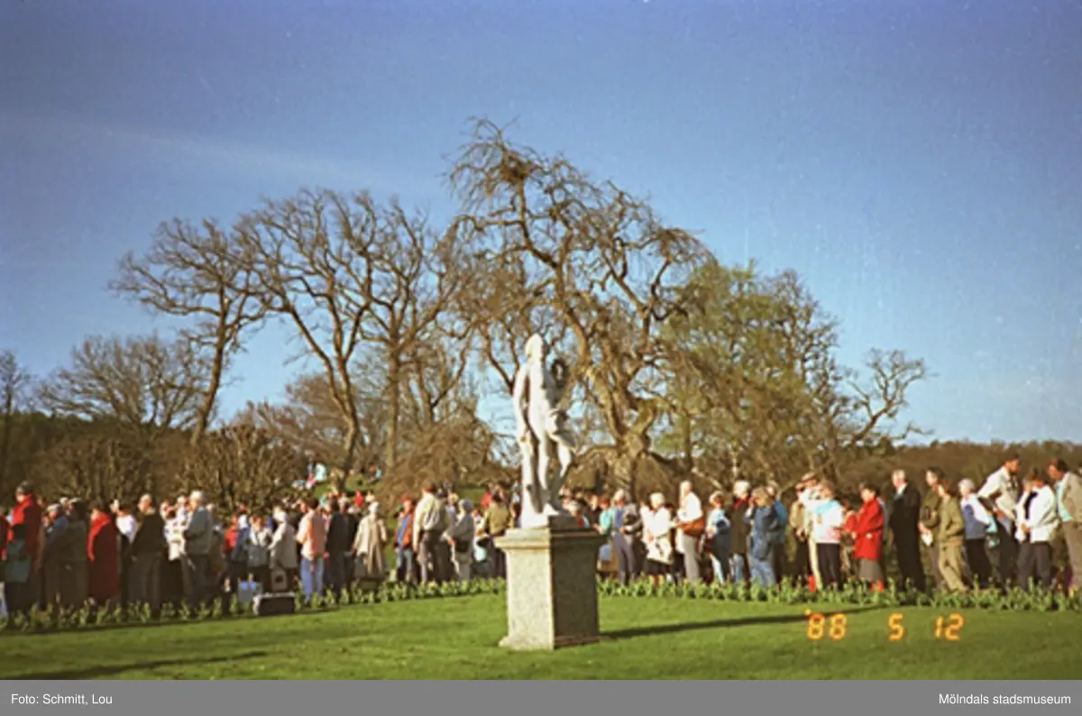 En skulptur ståendes på en stor gräsmatta i Gunnebo slottspark. I bakgrunden ser man människor som står och lyssnar/tittar på en studentkör (ej med i bild).