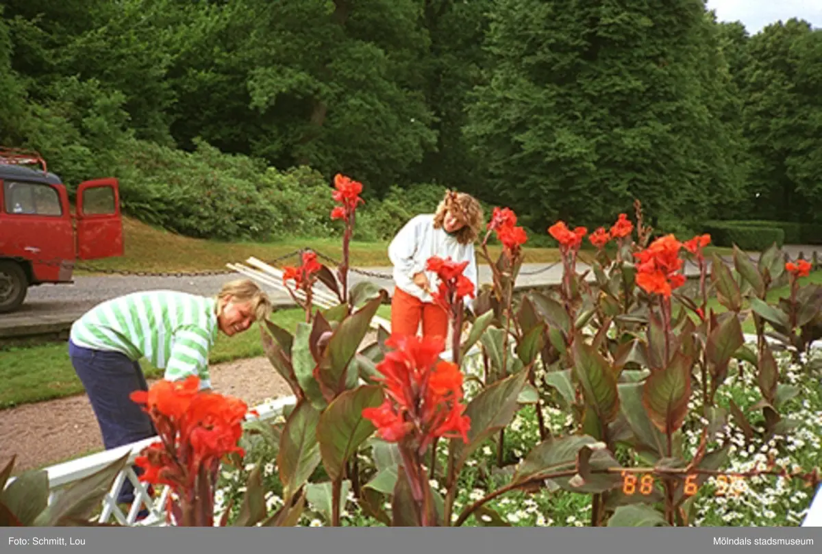 Två kvinnor som arbetar i en rabatt i Gunnebo slottspark. Till vänster i bakgrunden står en bil med öppen baklucka.