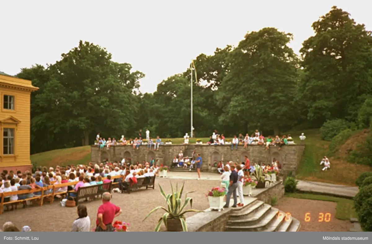 Vy från gräskullen, till höger om Gunnebo slotts framsida och kejsarterrassen. Publik som sitter och ser på en teaterföreställning. Man ser även en del av parkområdet och en 7-stegstrappa som leder från grusplanen.