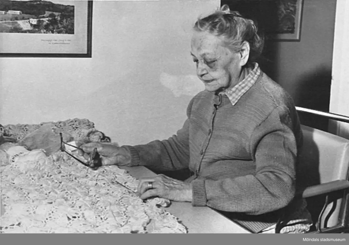 En kvinna sitter vid ett bord med garn i arbetsterapin på Lackarebäckshemmet, okänt årtal.