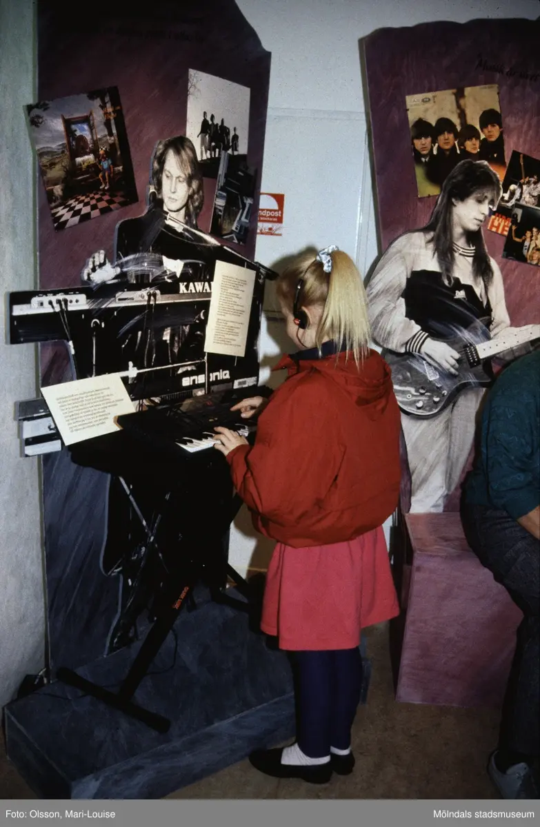 En flicka spelar på ett musikinstrument i utställningen "Från näckens polska till rockens roll" i Mölndals museum, Norra Forsåkersgatan 19 i Mölndal. Utställningen pågick från 1 december 1990 till 31 december 1991.