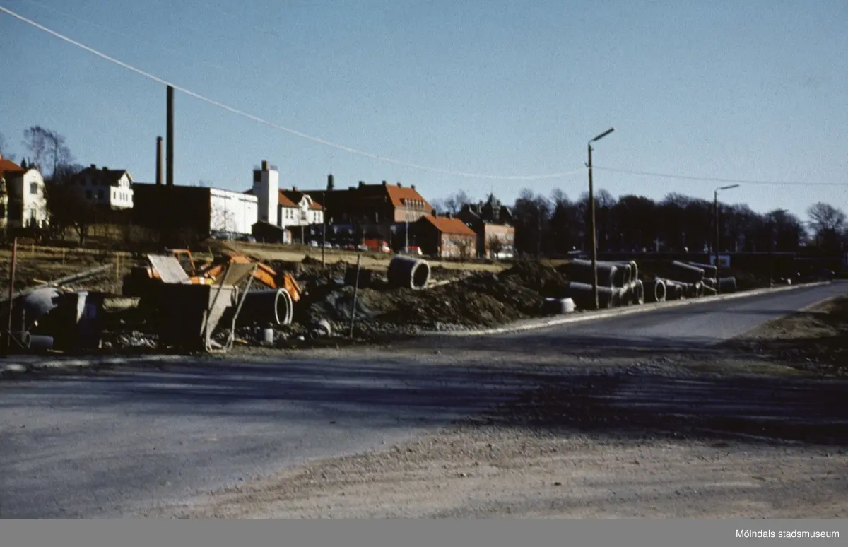 Vy från Järnvägsgatan mot Mölndals Brandstation (vit byggnad till vänster) och Kvarnbyskolan (röd byggnad rakt fram), Mölndal 1970-tal.