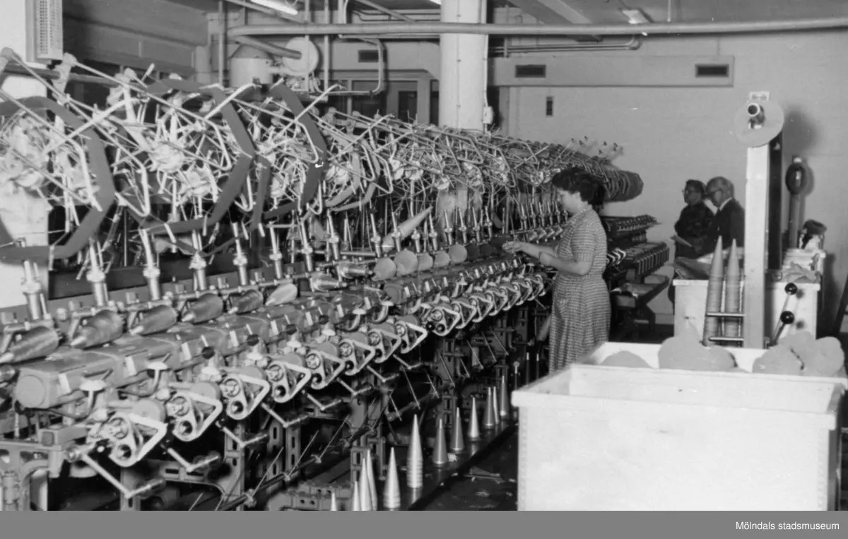 Elin Gustafsson står vid en spolmaskin i Viktor Samuelsons fabrik "Strumpan", 1960-tal.