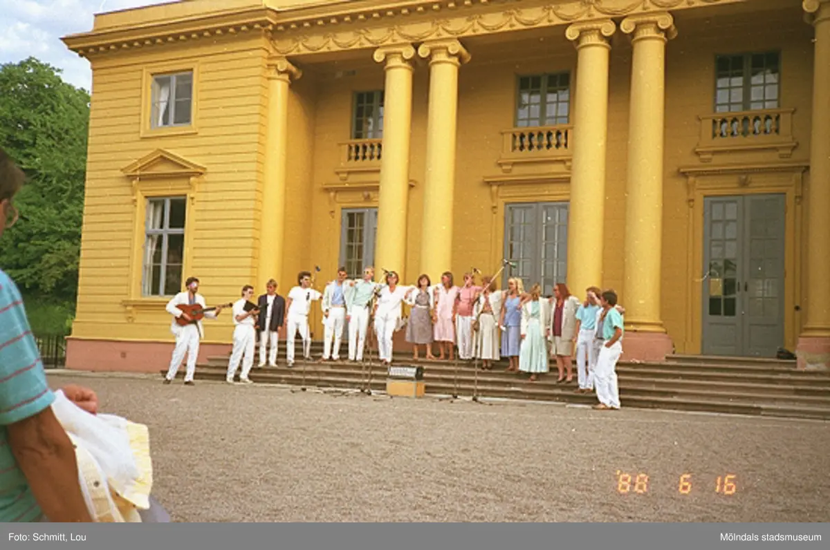 En kör och en gitarrist står uppställda på trappan till Gunnebo slotts framsida. De sjunger och spelar inför publik.