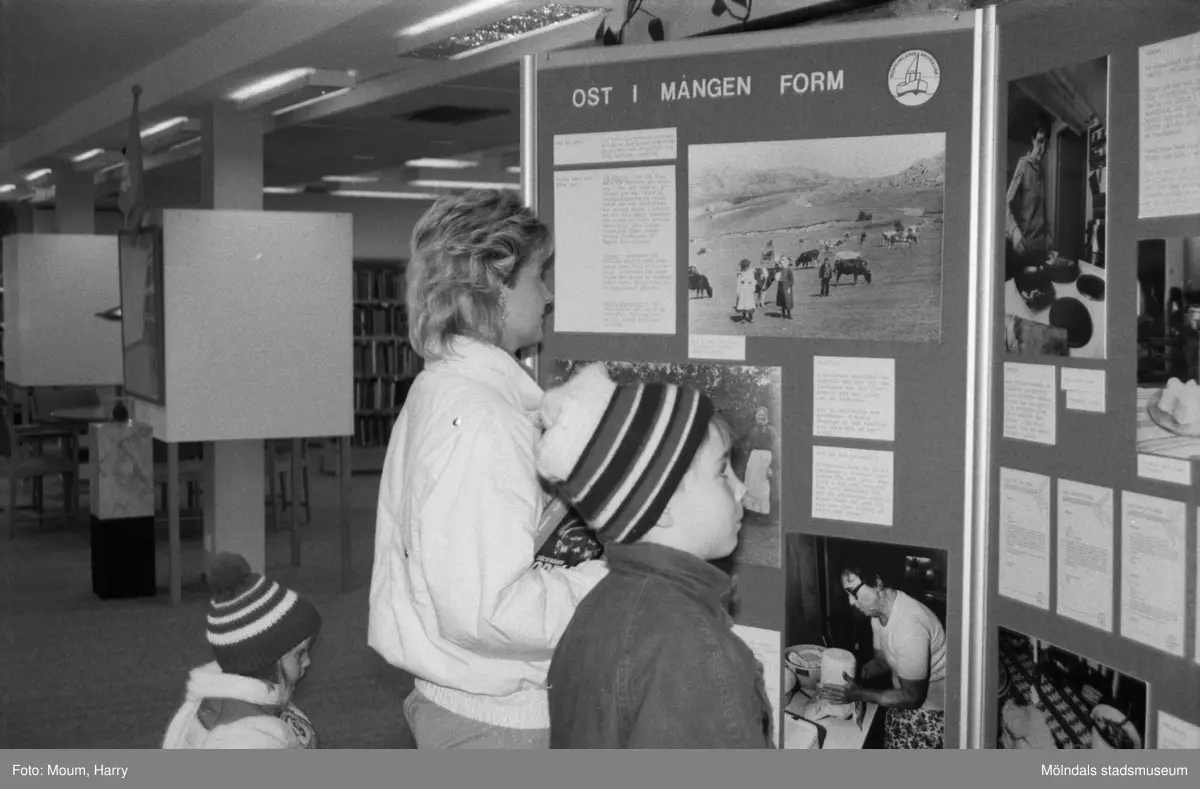 Utställning om ost på Kållereds bibliotek, år 1985. "Fredrik Issén och Carina Andersson begrundar utställningen "Ost i mången form" på Kållerds bibliotek."