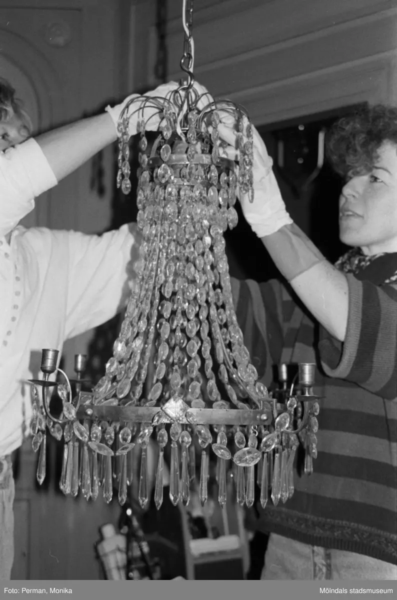 Antikvarisk storstädning på Gunnebo slott 1992. En kristallkrona som tas ner. Till höger i bild är föremålsansvarig Ulla Hasselqvist.
