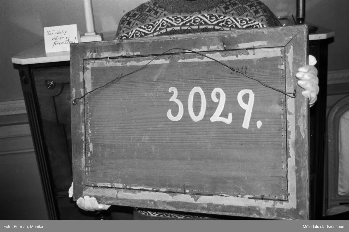 Antikvarisk storstädning på Gunnebo slott 1992. En person håller upp en tavla och visar baksidan, numrerat med 3029.