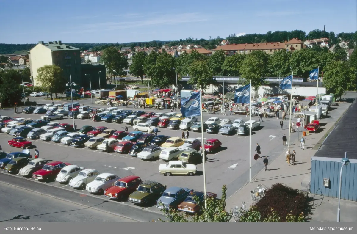 Så här såg det ut på Nya Torget en lördagsmorgon år 1973. Då kom bönder och affärsfolk hit och "dukade upp" sina varor till försäljning. På torget fanns god plats för parkering och till höger syns Konsums stora affärshall. I bakgrunden till vänster ses biografen Röda Kvarn och affärshusen vid Göteborgsvägen. Senare flyttades torghandeln till ett nytt torg i närheten av Åby Stormarknad inte långt från Kungsbackavägen.