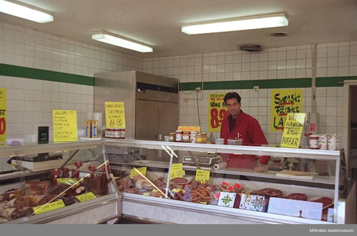 Interiör från en charkuteributik med dess personal. Mölndalsbro i dag - ett skolpedagogiskt dokumentationsprojekt på Mölndals museum under oktober 1996. 1996_1116-1134 är gjorda av högstadieelever från Kvarnbyskolan 9C, grupp 6. Se även 1996_0913-0940, gruppbilder på klasserna 1996_1382-1405 samt bilder från den färdiga utställningen 1996_1358-1381.