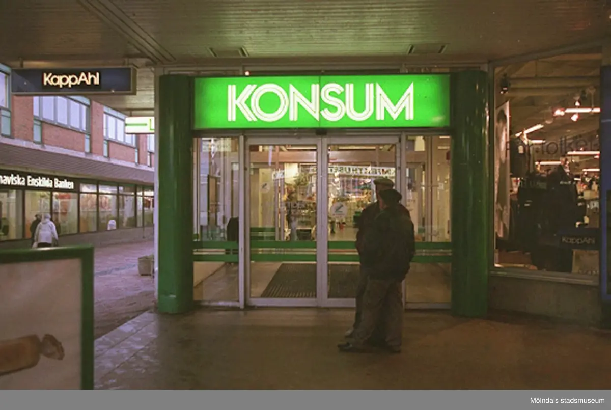 Huvudentré till Konsum på Brogatan. Mölndalsbro i dag - ett skolpedagogiskt dokumentationsprojekt på Mölndals museum under oktober 1996. 1996_1135-1152 är gjorda av högstadieelever från Kvarnbyskolan 9D, grupp 1. Se även 1996_0913-0940, gruppbilder på klasserna 1996_1382-1405 samt bilder från den färdiga utställningen 1996_1358-1381.