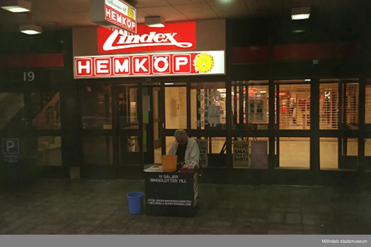 Huvudentré till Lindex och Hemhöp på Brogatan. Mölndalsbro i dag - ett skolpedagogiskt dokumentationsprojekt på Mölndals museum under oktober 1996. 1996_1135-1152 är gjorda av högstadieelever från Kvarnbyskolan 9D, grupp 1. Se även 1996_0913-0940, gruppbilder på klasserna 1996_1382-1405 samt bilder från den färdiga utställningen 1996_1358-1381.