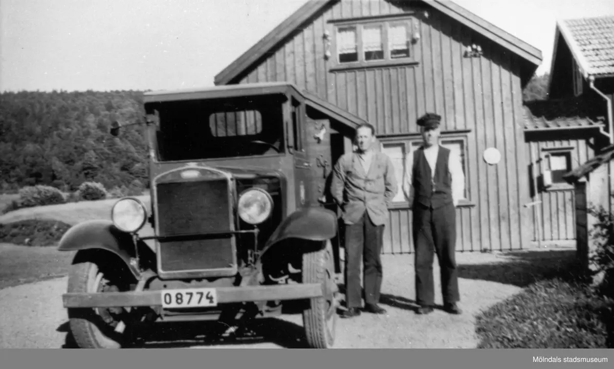 På 1920-talet bytte Anderstorps fabriker ut hästtransporterna mot biltransport. Här står chaufför Robert Börjesson vid den första bilen. Bredvid står lasthjälpare Erik Göransson.