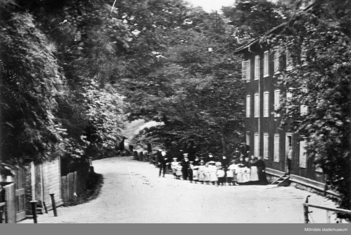 Anderstorp i Lindome, ca 1900. Detta är den s k gamla "byggningen" som låg vid bron. Stolparna som syns t.v är en port som leder till gamla fabriken vilken ligger