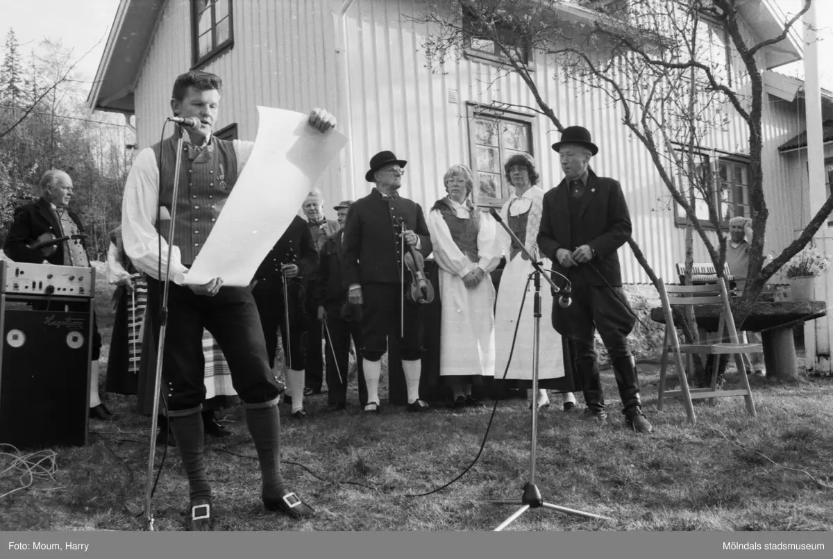 Almåsgården och Lindome hembygdsgille anordnar sommarkafé på Börjesgården i Hällesåker, år 1984. Budkavlen läses upp av Sven-Åke Svensson, ordförande i Lindome hembygdsgille.