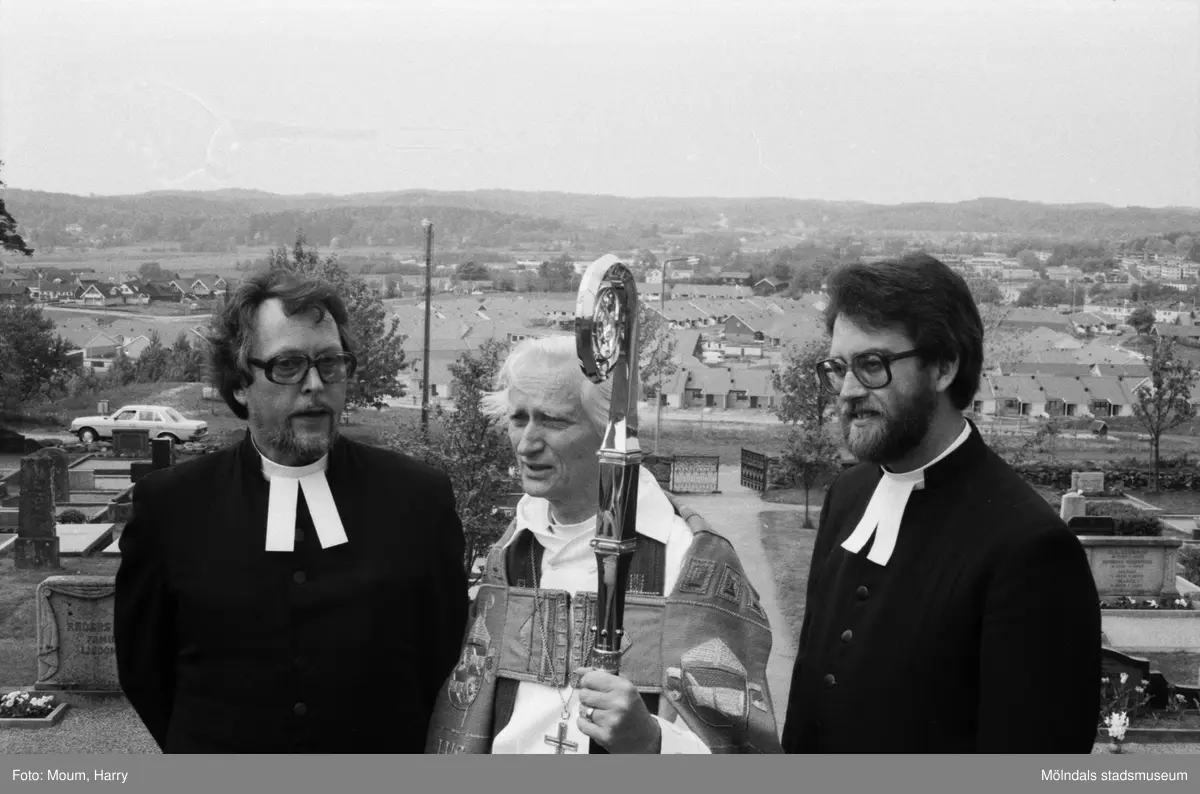 Lindome kyrka firar 100-årsjubileum, år 1985. "Från kyrktrappan blickar man ut över delar av Lindomebygden. Mats Oreklev, biskop Gärtner och Leif Adolfsson."
