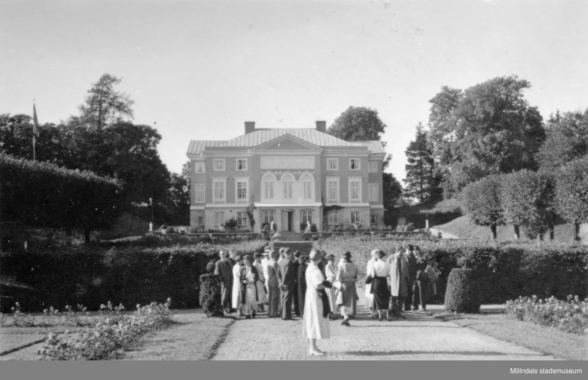 En grupp människor står i parkens trappa på Gunnebo slotts norra sida, 1930-tal.