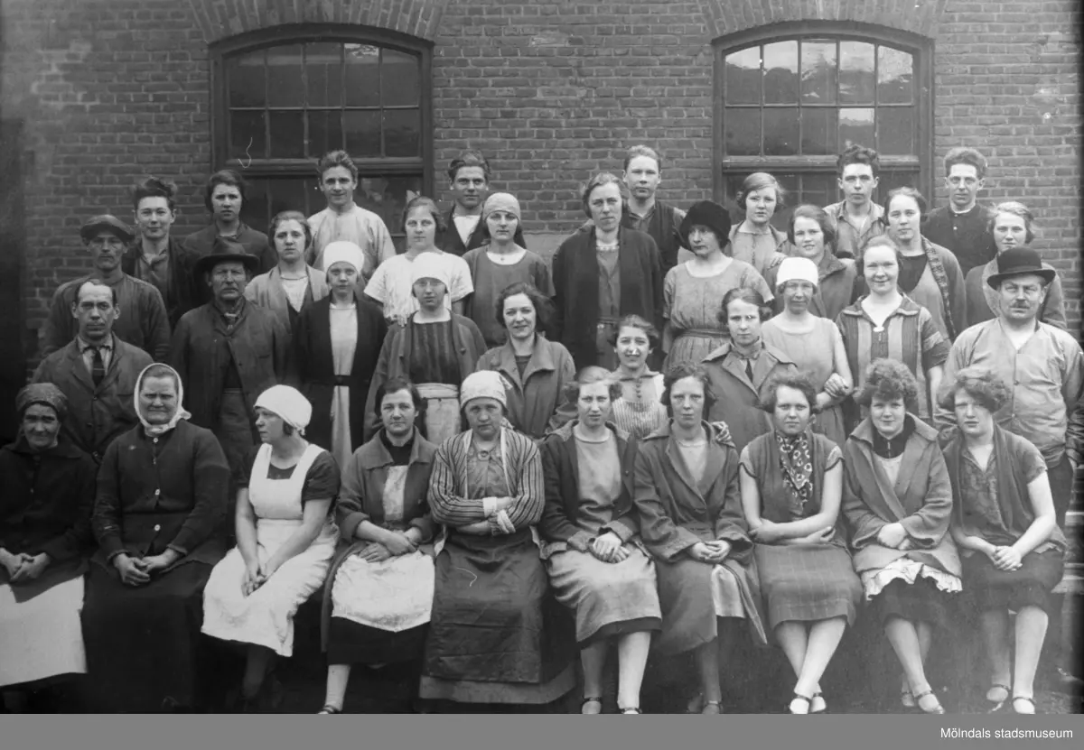 Arbetare utanför Gamla väveriet vid Krokslätts fabriker, år 1926. Längst bak till vänster står Arnold Rosell, barhuvad och med tjockt hårsvall.