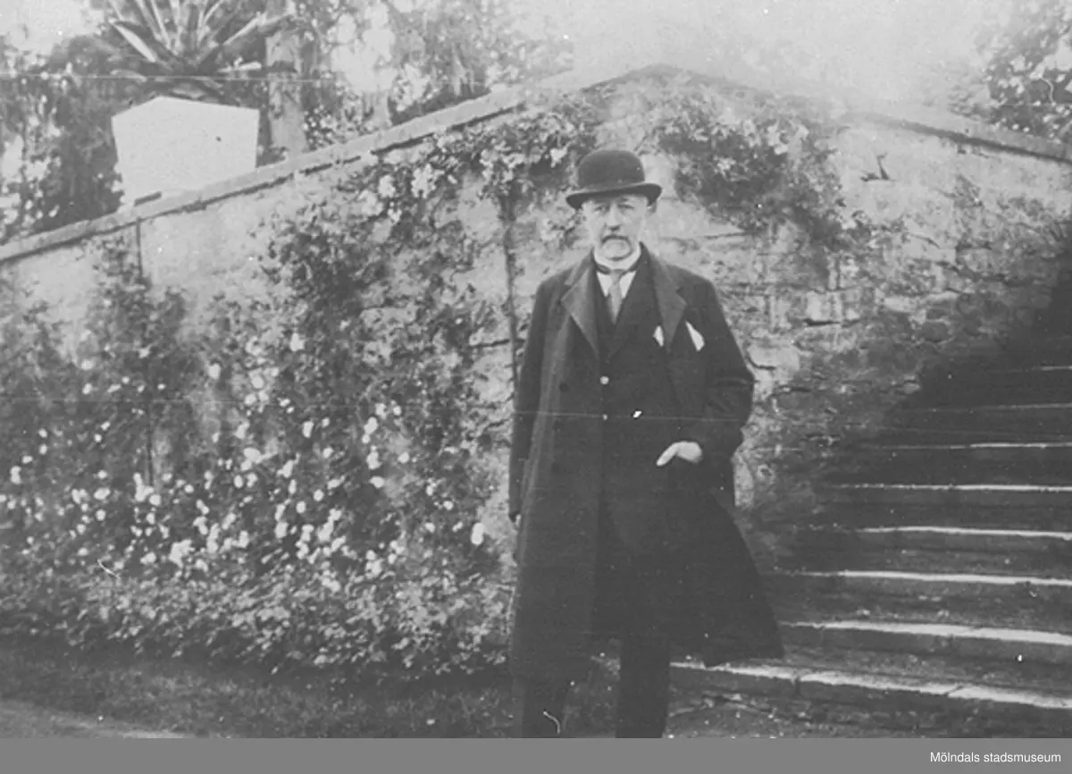 Prins Eugen ståendes framför Kejsareterrassen vid Gunnebo slott, september 1923. Detta år sammanträdde föreningen Röhsska konstslöjdmuséets vänner under ordförandeskap av Prins Eugen.