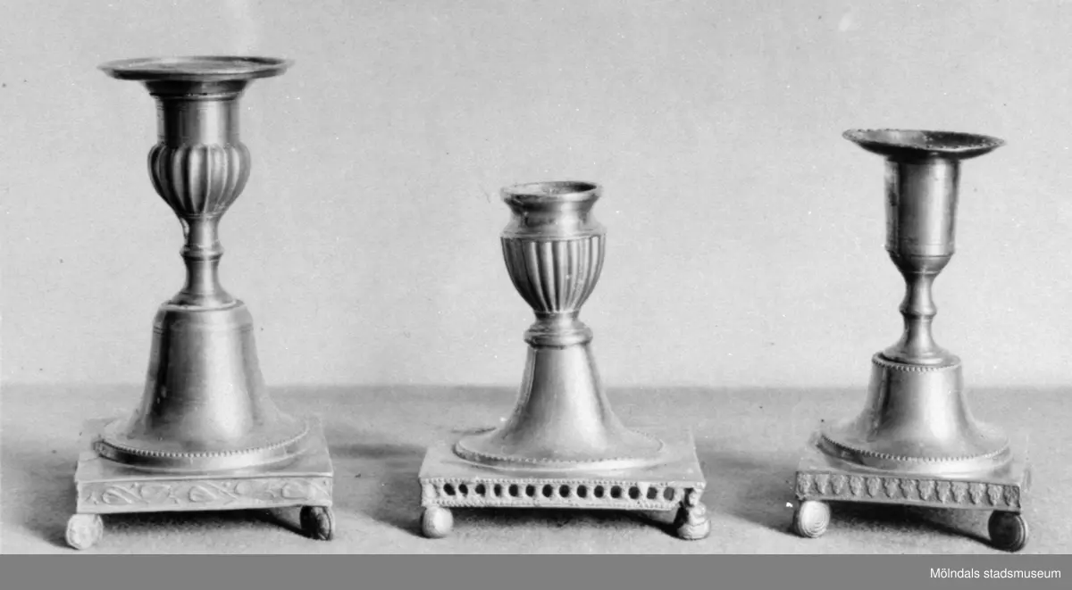 Tre ljusstakar av metall med varierande design och höjd. Samtliga står på var sin sockel. Gunnebo slott, 1930-tal.