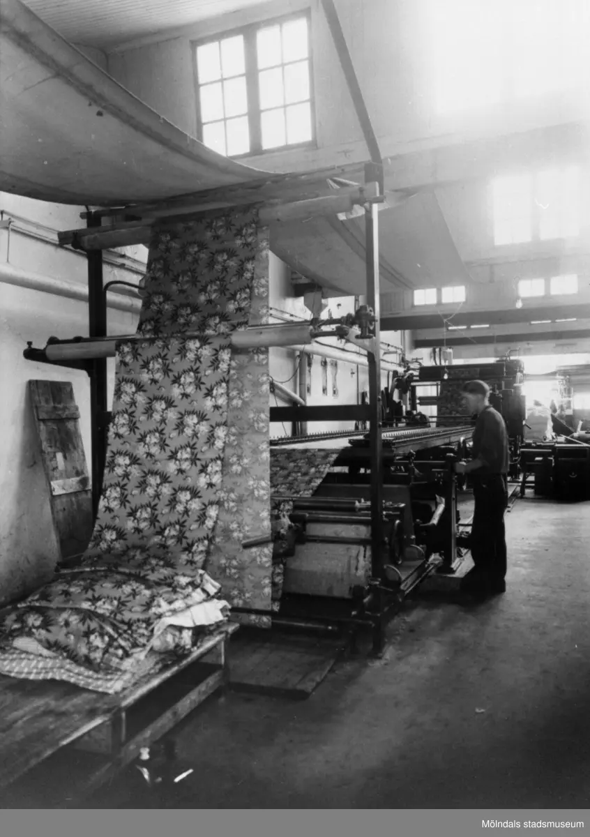 Tyget sträcks och rättas i en av spännramarna i Krokslätts fabrik.