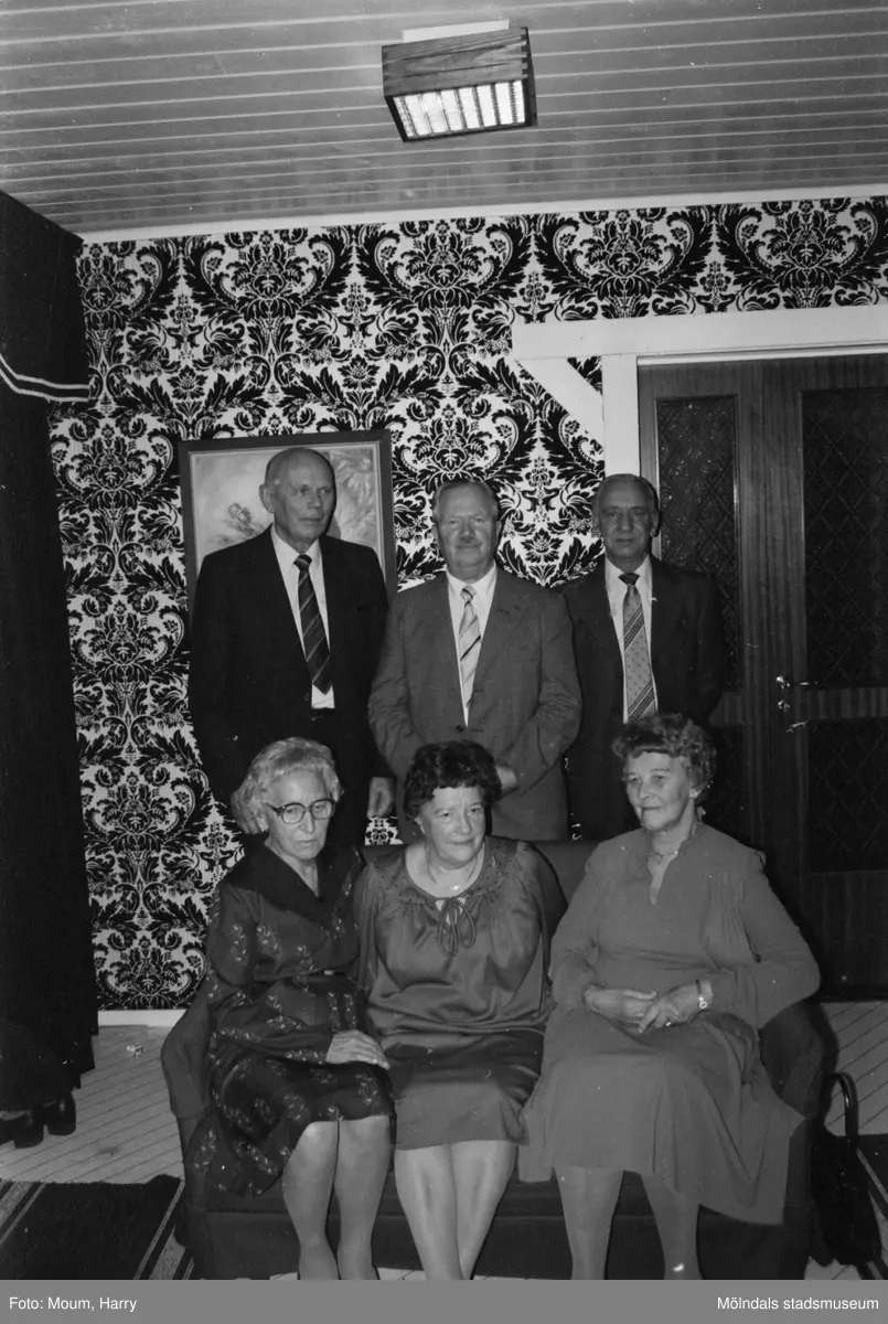 Kållered PRO firar 10-årsjubileum på Kållereds Värdshus, år 1983. "Här är "Hjärntrusten" Kållereds PRO. Stående fr. v.: Arne Ahlström, kassör, Gunnar Eliasson och Elof Johansson. Sittande fr. v. Sigrid Börjesson, ordförande, Ingrid Nilsson, sekreterare och Vera Eliasson."