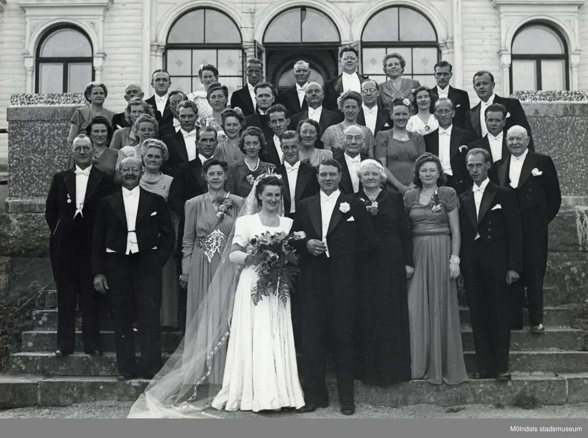 Foto, ur album som tillhört Edit Melin, med bildtext: "Fotograferat utanför Slottsvikens pensionat 1947. "Edit Viola Persson föddes 31/10 1918. Hon växte upp på Wallinsgatan i Mölndal där hennes far Verner Persson ägde och drev en handelsträdgård. Modern Hette Elvira men kallades Vera. Edit hade två bröder, storebror Fritz och lillebror Per Olof "Pelle". Hon arbetade åt sin far redan som barn med grönsaksodling o. dyl. "Vi fick trycka ner folkskiten runt gurkorna med bara händerna", berättade hon. Verner var mycket sträng och barnen fick jobba hårt. I ungdomen gick hon på Wendelsbergs folkhögskola. Hon träffade Åke Melin från Kållered som tillsammans med brodern Gösta Melin hade Bröderna Melins Vattenfabrik. Åke och Gösta drev även ett mindre cementgjuteri och sågade is på Tulebosjön om vintrarna. Edit och Åke gifte sig 28/6 1947 på Slottsvikens pensionat. Paret fick två söner, Lars Åke och Sven Olof (Olle). Under några år på 1950-talet ägde hon Edits Blomsterhandel på Sanatoriegatan 27 i Kålltorp. Hon jobbade sedan i vattenfabriken tills den lades ned 1974. Edit avled 11/10 2000 efter en tids sjukdom.