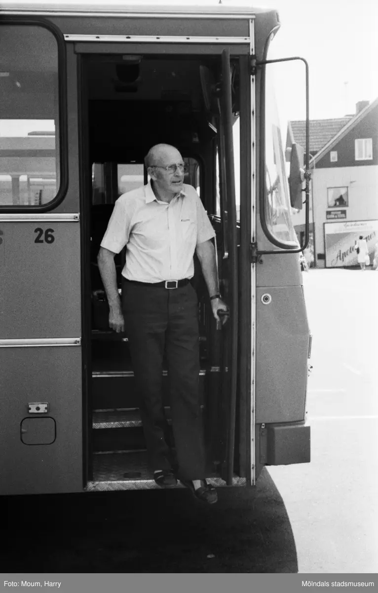 En manlig chaufför stiger ur Kålleredsbuss vid Gamla Riksvägen i Kållereds centrum år 1983.