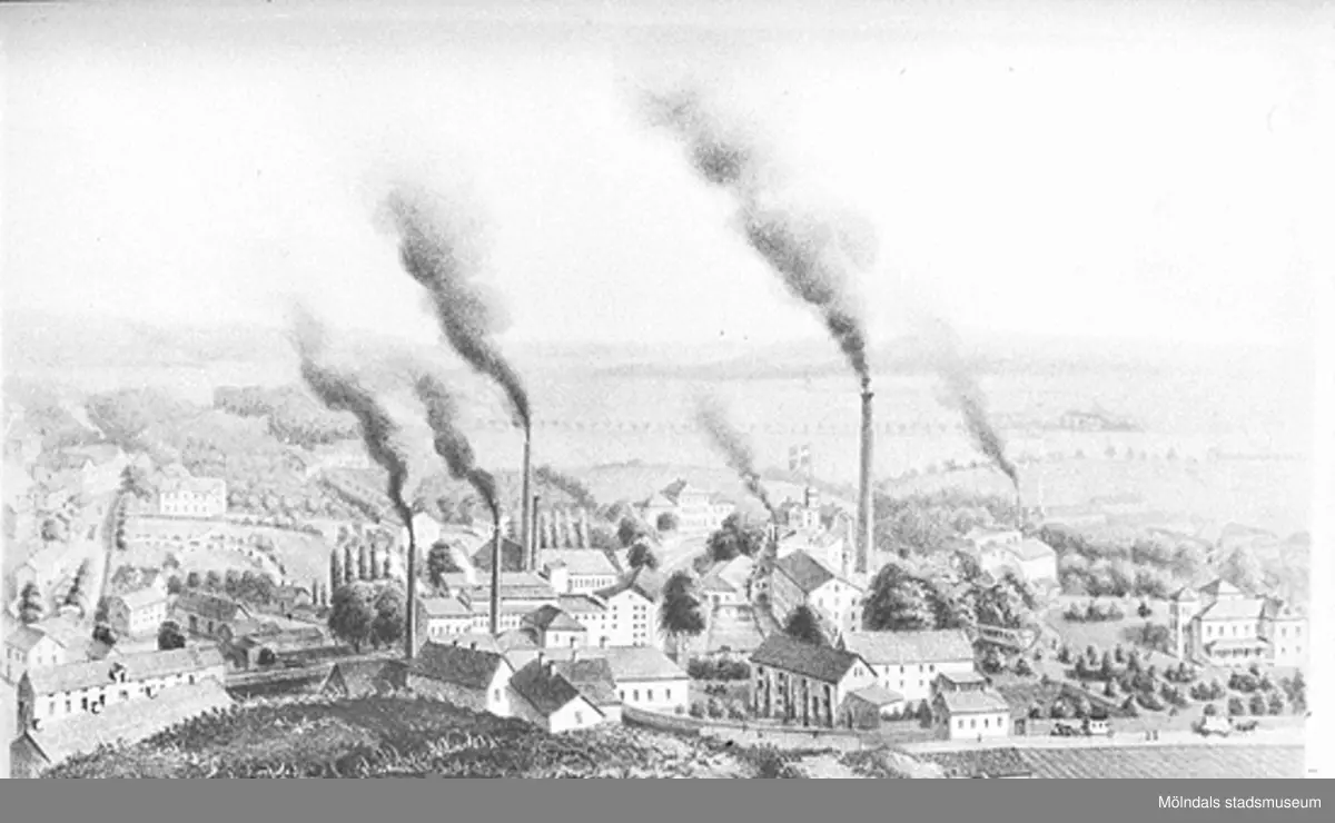 Målning över fabriksindustrin längs fallen i Kvarnbyn